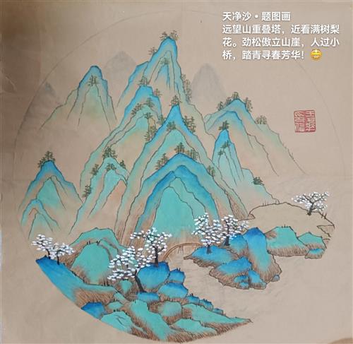 远山峰峦叠塔,近岸满树梨花。青松傲立山崖,人过小桥,踏春寻梦芳华。