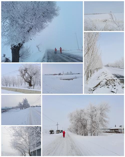 正月时光,北疆农场。巡野外工作路上。三番风雪,吹田盖壤。望树枝琼,房屋霜,原野茫!