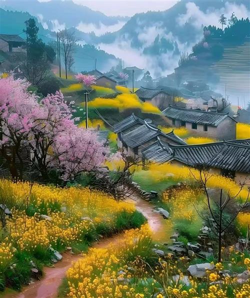 春踏新安,翠峰碧水,风光无限。雪杏红桃,惠风揺柳,菜花香灿。