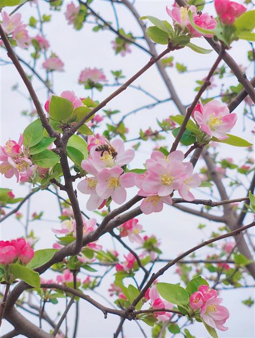 杏桃妩媚田园灿,日出群蜂花卉迎。