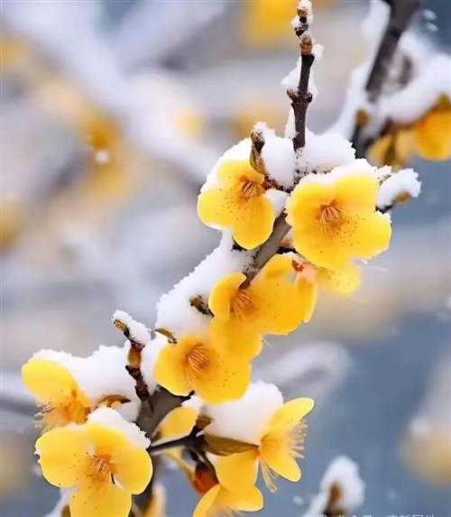 小精灵。落无声息,争似蝴蝶轻盈。又恰似玉甲龙鳞,刀戟银戈乱舞,昭如宇穹坠星。红梅雪中光艳,朵朵琼瑶,花带冰晶。