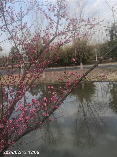 江畔春光耀眼明,桃花灿烂醉霞英。