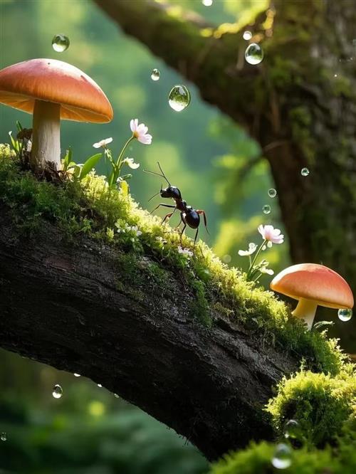 古林苍翠蔽云天,苔润阶前。露凝新蕈玲珑立,映晨光、珠玉生烟。蚁阵穿茵行缓,青枝垂影听泉。